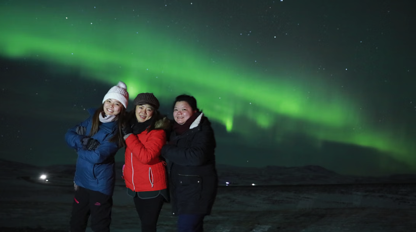 Travellers posing under the northern lights