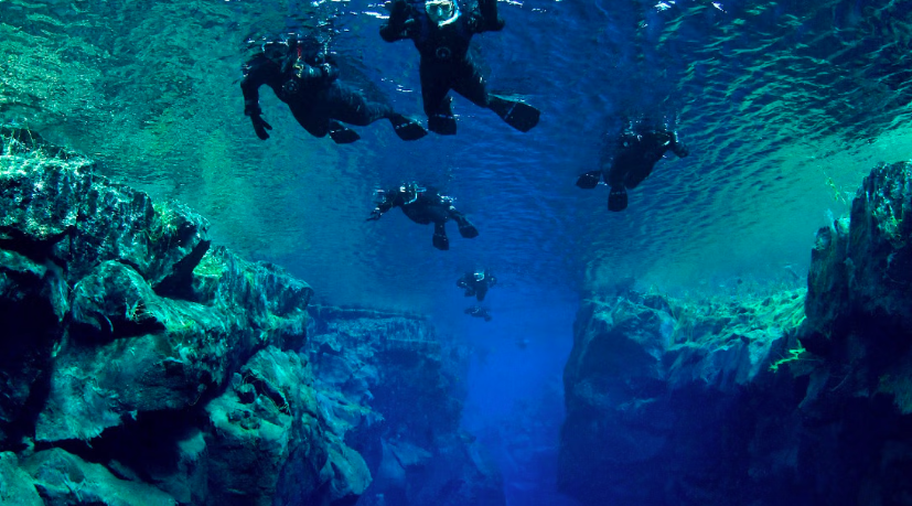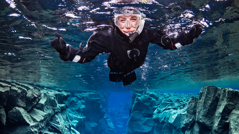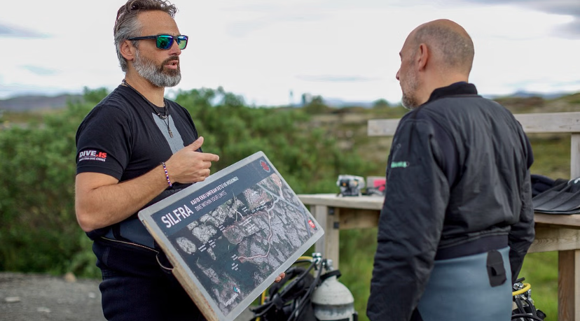 Snorkeling between continents in Silfrá Groupe de plongeursPlongeur souriantGuide donnant des instructionsGuide donnant des instructionsUn visiteur apprend à faire de la plongée avec tuba