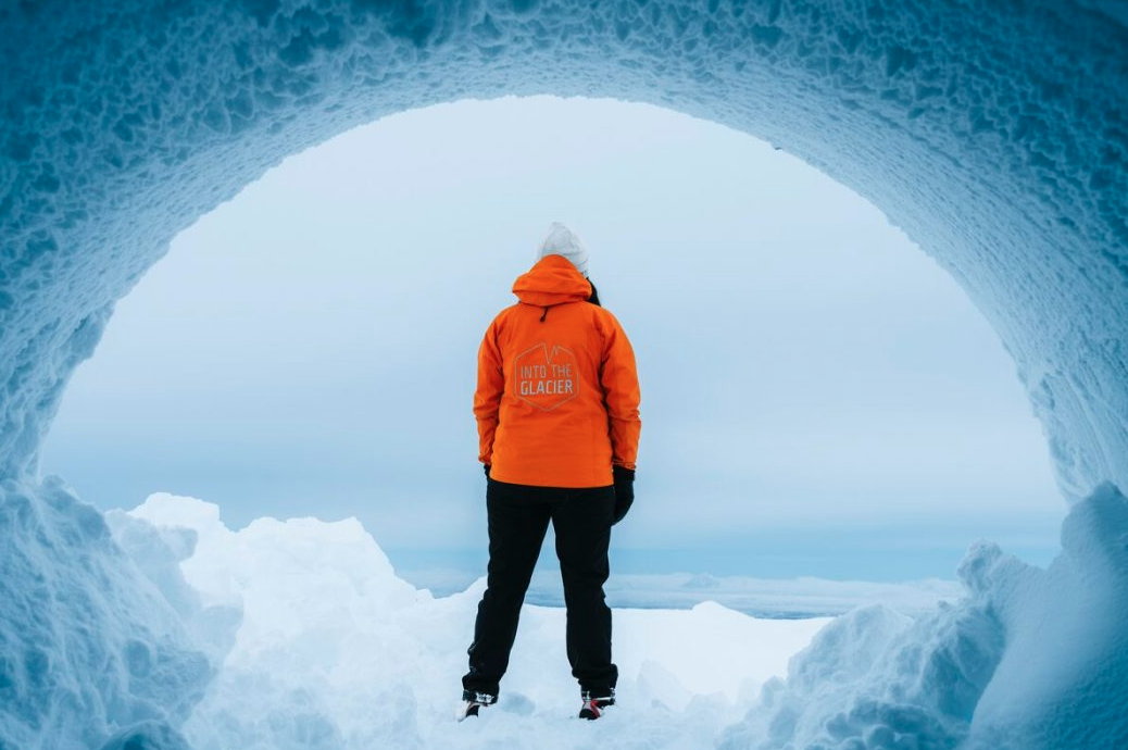 Into the Glacier Traveller exploring the ice caveTraveller exiting the ice caveExploring the man-made ice caveIcy glacier landscapes all around the ice caveSpecial glacier monster truck transportation to Into the Glacier