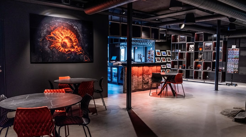 Lava Show Visitors contemplating lavaHost manipulating lavaReal lava meltingEntrance to the exhibitionLounge and souvenir shop
