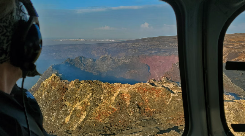 Volcano Helicopter Elicottero in volo vicino al vulcanoElicottero e fumo del vulcanoLava recente Visitatori che scattano fotoVista dall'interno dell'elicotteroPartenza da Reykjavík