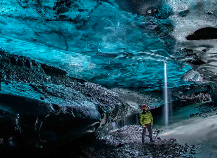 Traveller in a natural ice cave