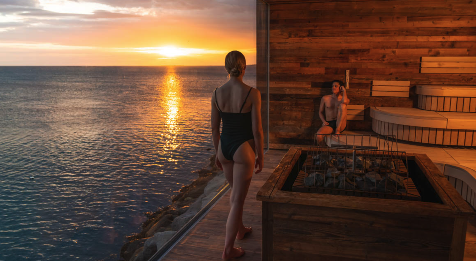 Sky Lagoon Guest enjoying a bath at Sky LagoonSignature body scrub at Sky LagoonOcean view Sauna experience at Sky LagoonVisitors relaxing at Sky LagoonSky Lagoon infinity pool on the oceansideSky Lagoon changing facilities